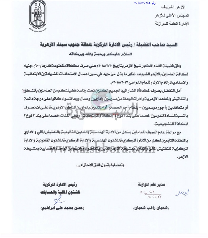 وافق الامام الاكبر شيخ الازهر على صرف مكافأة مقطوعة قدرها ( 600 ) جنيه لكافة العاملين بالازهر الشريف نظير مابذل من جهد فى سير اعمال الامتحانات للشهادتين الابتدائية والاعدادية الترم الاول للعام الدراسى 2017-2018 .