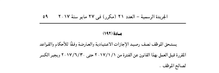 أفاد محمد حسين الجعفرى الناشط التعليمى أن المعلمين والمعلمات ممن يعملون بنظام العمل جزء من الوقت مقابل نسبة من الاجر الاجازات العارضة 5 أيام خلال السنة المالية التي تبدا في 1-7-2017م وتنتهي في 30-6-2018م حيث نص القانون في المادة رقم 147 من اللائحة التنفيذية لقانون الخدمة المدنية رقم 81 لسنة 2016 م الصادرة بقرار رئيس مجلس الوزراء رقم 1216 لسنة 2017م على حصول الموظف على 65 % من اجازاته الاعتيادية والمرضية والعارضة ( 7 أيام × 65 % = 4.55 يوم يجبر الكسر لصالح الموظف يبقي = 5 أيام عارضه ).