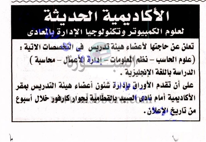 تعلن الاكاديمية الحديثة لعلوم الكمبيوتر وتكنولجيا الادارة بالمعادى عن حاجتها الى أعضاء هيئة التدريس، على ان تقدم الأوراق بادارة شئون أعضاء هيئة التدريس بمقر الاكاديمية، كما منشور فى الاعلان جريدة الأخبار اليوم السبت الموافق 24 فبراير 2018.