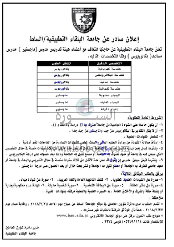 تعلن جامعة البلقاء الأردنية عن وظائف جديدة لأعضاء هيئة التدريس"من معيد إلي أستاذ" وذلك وفقا لنص الإعلان التالي: