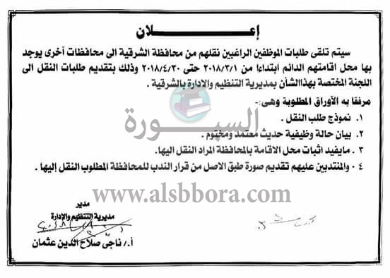 أعلنت مديرية التنظيم والادارة بمحافظة الشرقية عن تلقى طلبات الراغبين فى النقل من المحافظة الى أى محافظة أخرى بداية من أول مارس 2018، وحتى آخر إبريل 2018، وأرفقت فى الاعلان الأوراق المطلوبة.