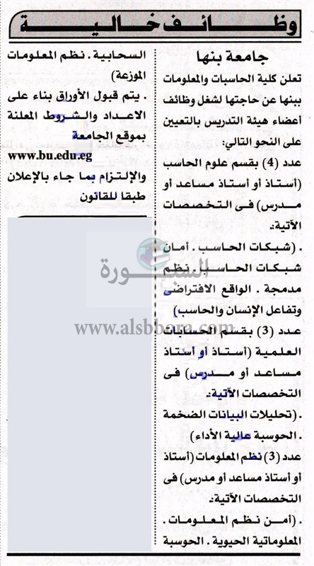 أعلنت جامعة بنها عن وظائف جديدة لأعضاء هيئة التدريس"من حملة الماجستير والدكتوراه" وذلك وفقا لنص الإعلان التالي:-