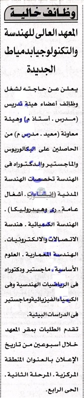 يعلن المعهد العالى للهندسة والتكنولوجيا بدمياط الجديدة عن حاجته الى أعضاء هيئة التدريس فى عدد من التخصصات وعلى الراغبين فى التقدم تقديم الطلبات بمقر المعهد خلال أسبوعين من تاريخ نشر الاعلان والذى تم نشره اليوم الأربعاء بجريدة الأهرام.