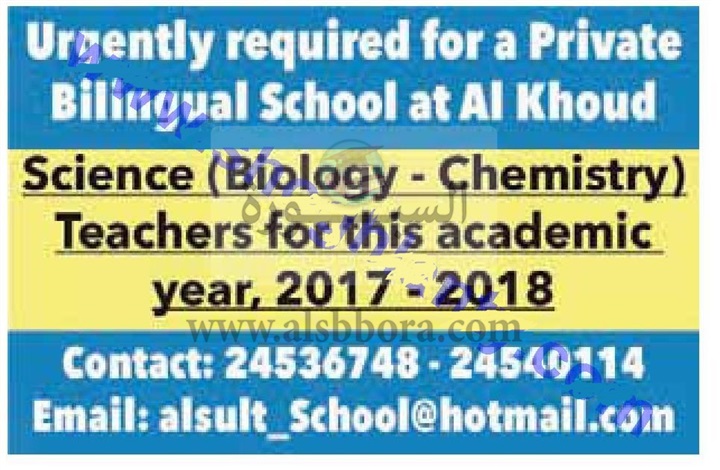 تعلن كبرى المدارس بسلطنة عمان عن حاجتها الى معلمين، وعلى الراغبين فى التقدم ارسال السيرة الذاتية عبر الايميل المنشور فى الاعلان التالى: