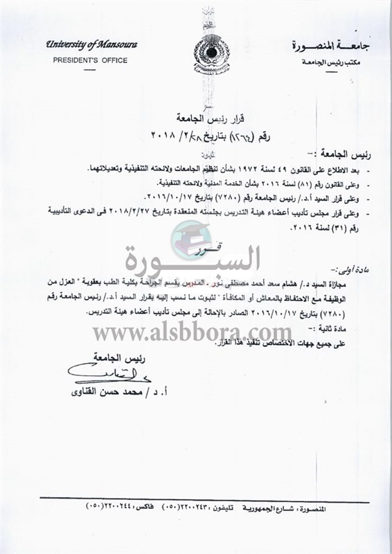 اصدرت جامعة المنصورة قرارا بعزل الدكتور هشام سعد نور المدرس بقسم الجراحة بكلية الطب من وظيفته مع الاحتفاظ بالمعاش أو المكافأة وذلك لثبوت ما نسب إليه بسبب سلوكه واستنادا إلى قرار رئيس الجامعة رقم 7280 الصادر بتاريخ 17 أكتوبر عام 2016 الصادر للإحالة إلى مجلس تأديب أعضاء هيئة التدريس.