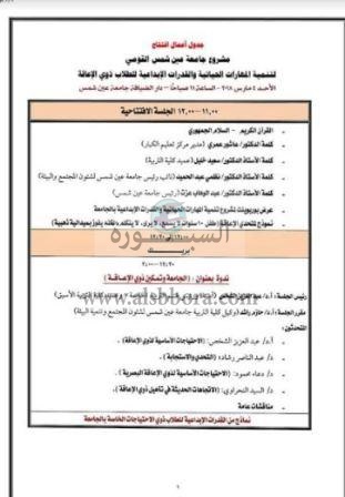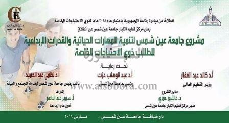 انطلاقًا من مبادرة رئاسة الجمهورية باعتبار عام 2018 عاما لذوي الاحتياجات الخاصة،وبرعاية خالد عبد الغفار وزير التعليم العالي، عبد الوهاب عزت رئيس جامعة عين شمس، ونظمي عبد الحميد نائب رئيس الجامعة لشئون خدمة المجتمع وتنمية البيئة، يشرفنا دعوة سيادتكم لحضور افتتاح مشروع جامعة عين شمس لتنمية المهارات الحياتية والقدرات الإبداعية للطلاب لذوي ذوى الإحتياجات الخاصة بالجامعة، وذلك يوم الأحد 4 مارس 2018، الساعة 11 صباحًا، بدار الضيافة جامعة عين شمس.