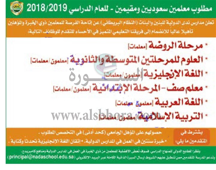 تعلن مدارس ندى الدولية للبنين والبنات "النظام البريطانى" بالمملكة العربية السعودية فى منطقة الأحساء عن حاجتها الى معلمين ومعلمات سعوديين، للعام الدراسى 2018/2019 وفقا للشروط المنشورة فى الاعلان التالى: