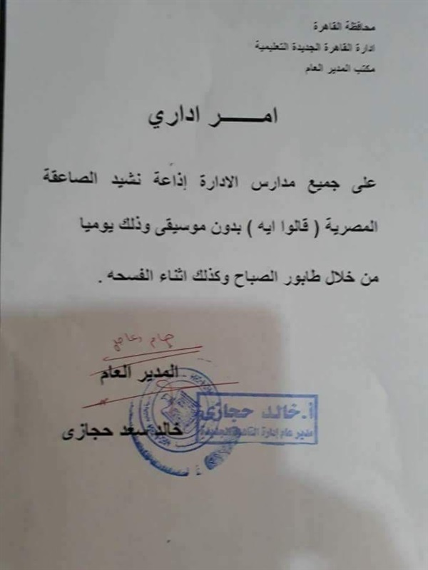 علي جميع مدارس الإدارة إذاعة نشيد الصاعقة المصرية"قالوا ايه " بدون موسيقي وذلك يوميا من خلال طابور الصباح وكذلك أثناء الفسحة" وتم إصدار هذا الأمر الإداري من مكتب المدير العام بإدارة القاهرة الجديدة التعليمية ،محافظة القاهرة ،هذا ولم تبدي التعليم أي تصريح بخصوص هذا الشأن وهل هو سليم قانونيا أم هل يعتريه أي خلل