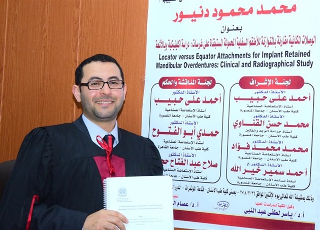 ناقش محمد دنيورالمدرس المساعد بكلية طب الاسنان بجامعة الدلتا للعلوم والتكنولوجيا رسالة الدكتوراة المقدمة للحصول على درجة الدكتوراه تحت عنوان "دراسة إكلينيكية وبالآشعة عن الوصلات المكانية مقارنة بالوصلات المتوازنة للأطقم السفلية المستبقاه علي غرسات