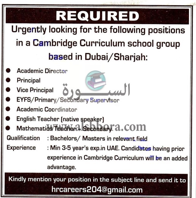 أعلنت مدرسة خاصة في دولة الإمارات عن حاجتها للتعاقد علي وظائف جديدة للمعلمين والمعلمات وذلك وفقا لنص الإعلان التالي:-