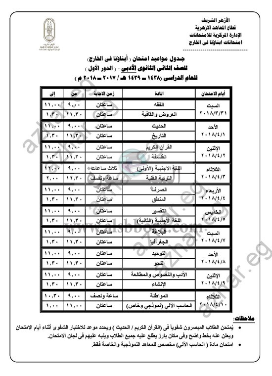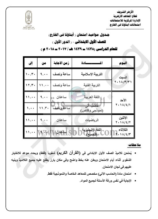 الامتحانات يوم السبت 31/3/2018 وتستمر حتى الثالث من أبريل، للصفوف: الأول