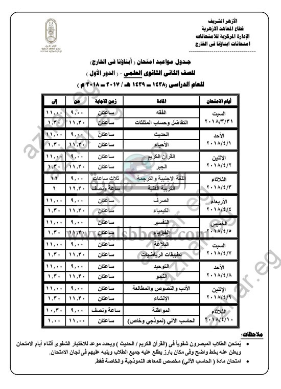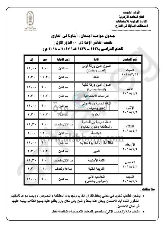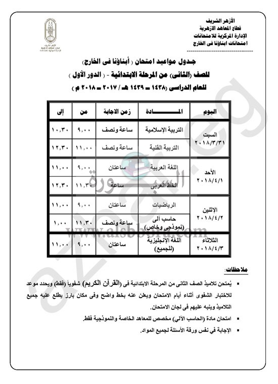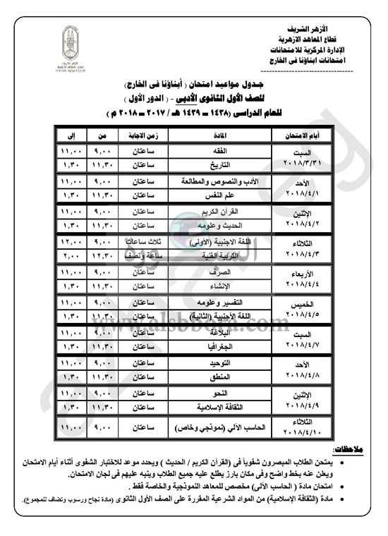 كشفت الإدارة المركزية للامتحانات بقطاع المعاهد الأزهرية، جداول امتحانات "أبناؤنا فى الخارج"، للمرحلة الابتدائية والإعدادية والنقل من المرحلة الثانوية للعام الدراسى 2017/2018، بداية من الصف الأول الابتدائى حتى الصف الثانى الثانوى، بقسميه: العلمى والأدبى.