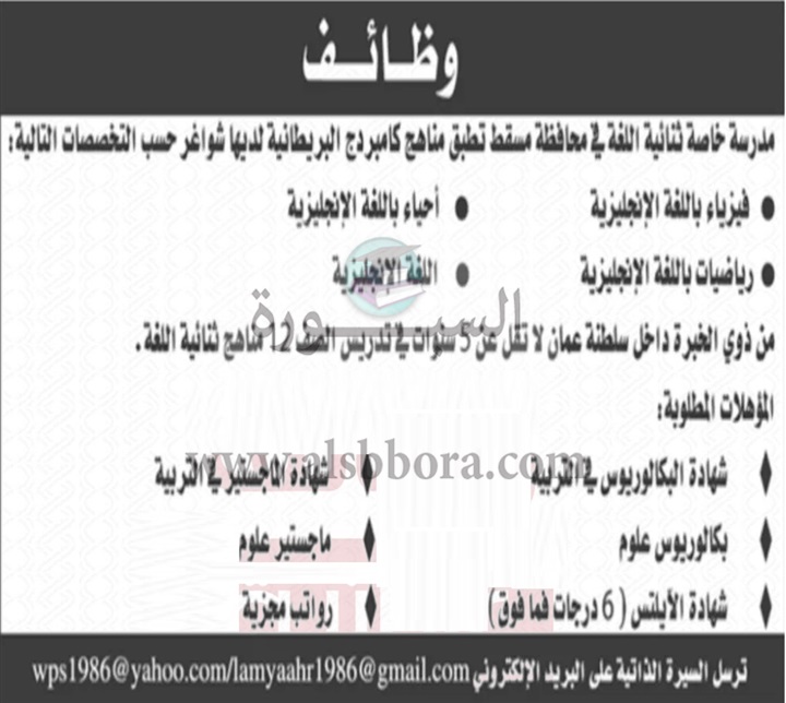 تعلن مدارس مسقط العمانية عن وظائف جديدة للمعلمين والمعلمات وذلك وفقا لنص الاعلان التالي:-
