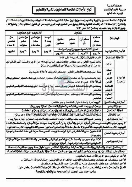 بالمستندات| ننشر جميع أنواع الأجازات للمعلمين والإداريين وفقا للدرجات الوظيفية وطبقا للقانون "155" وتعديلاته