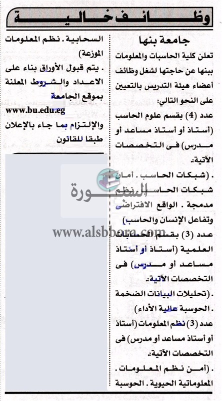 تعلن جامعة بنها عن وظائف جديدة لأعضاء هيئة التدريس"من معيد إلي أستاذ" علما بأن أخر موعد للتقديم 13 مارس وذلك وفقا لنص الإعلان التالي:
