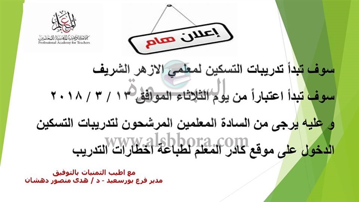 أعلنت الاكاديمية المهنية للمعلمين عن بدء تدريبات التسكين لمعلمى الأزهر اعتبارا من يوم الثلاثاء الموافق 13 مارس الجارى.