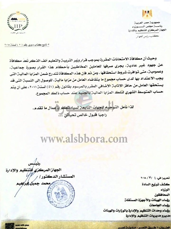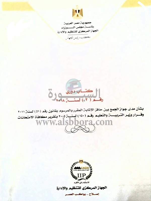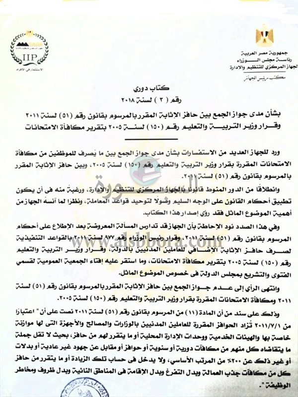 ينشر موقع السبورة رد الجهاز المركزى للتنظيم والادارة التابع لمجلس الوزراء بشأن جواز الجمع بين حافز الاثابة للمعلمين ومكافأة الامتحانات، حيث جاء فى الكتاب الدورى التالى: