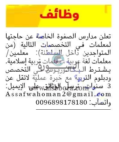 تعلن مدرسة خاصة في سلطنة عمان عن وظائف جديدة للمعلمين والمعلمات وذلك وفقا لنص الإعلان التالي:-