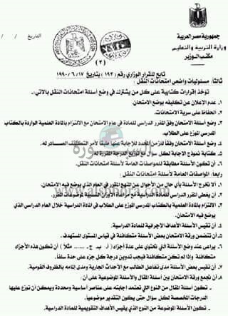 تعرف على القرار الوزارى رقم 192 بشأن المعلمين واضعى اسئلة امتحانات النقل