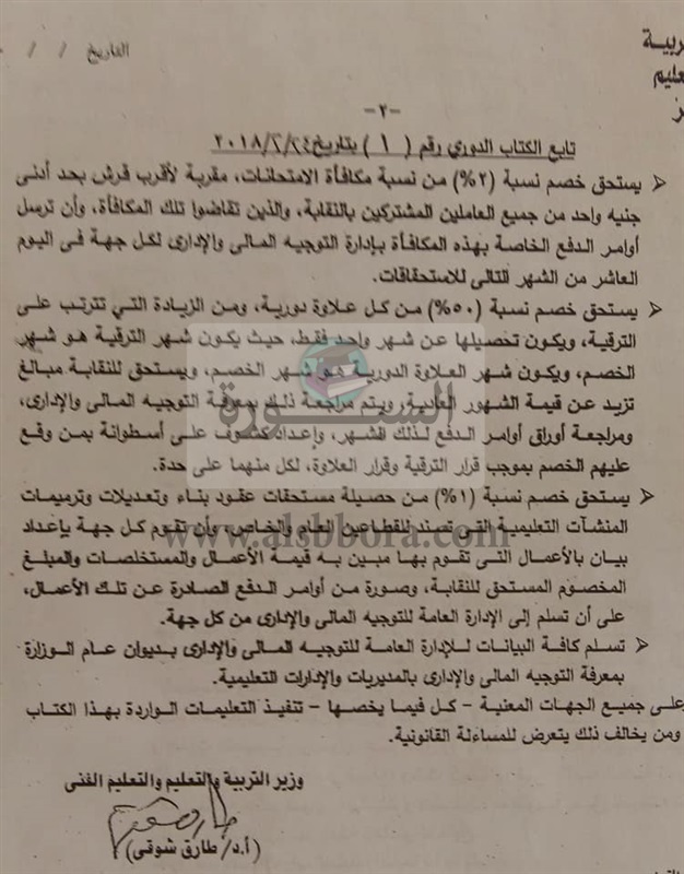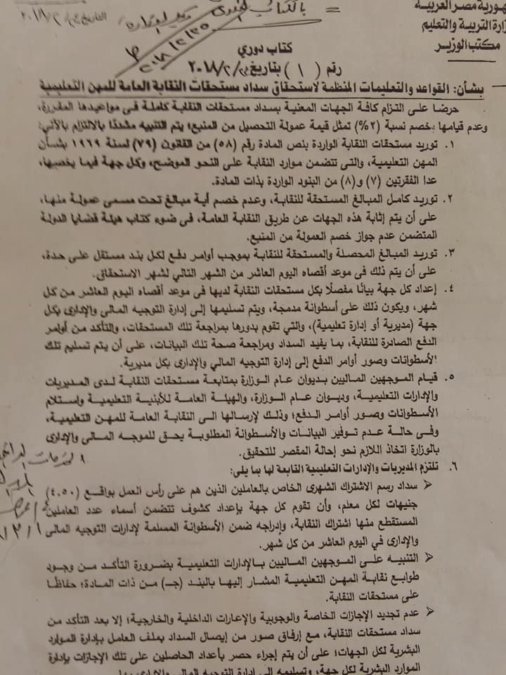 أرسلت نقابة المهن التعليمية كتابا دوريا رقم (1) بتاريخ 22 فبراير 2018، بشأن القواعد والتعليمات المنظمة لاستحقاق سداد مستحقات النقابة العامة للمهن التعليمية، والتى جاءت كالتالى: