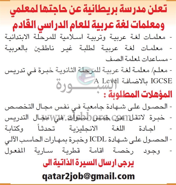 تعلن المدرسة البريطانية في قطر عن وظائف جديدة للمعلمين والمعلمات وذلك وفقا لنص الإعلان