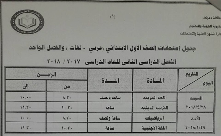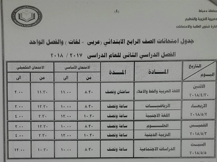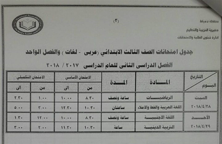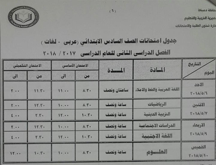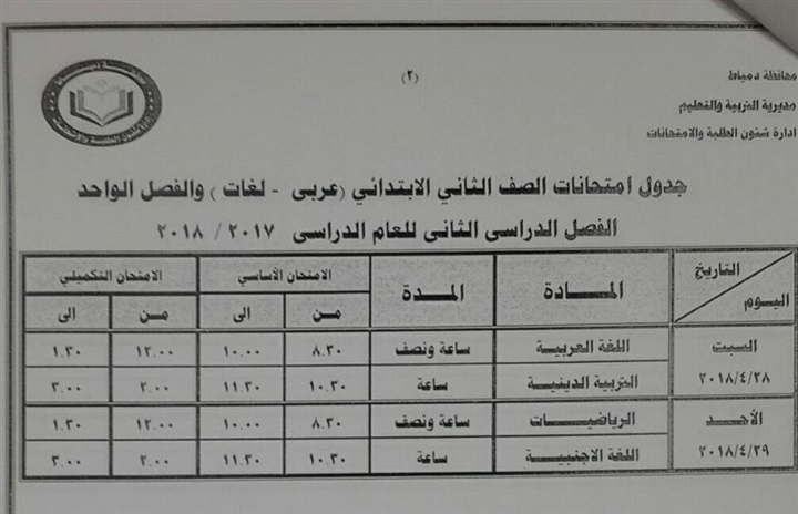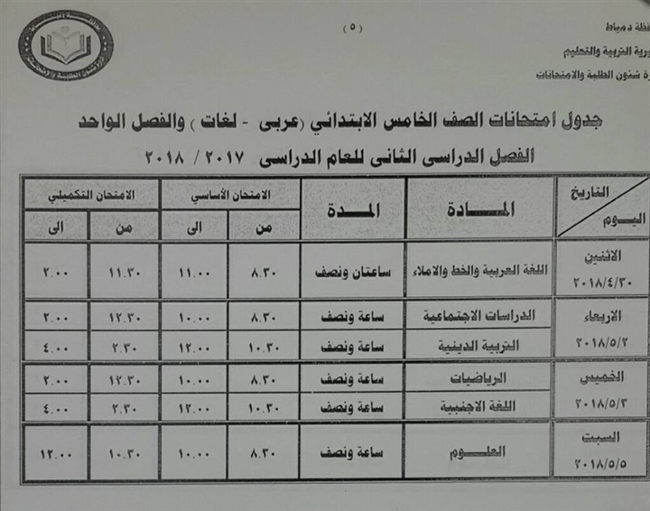 اعلنت مديرية التربية والتعليم بدمياط عن جدول امتحانات المرحلة الابتدائية للفصل الدراسى الثانى والذى جاء كالتالى: