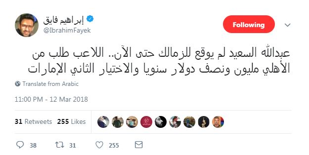 وكتب ابراهيم فايق على صفحته الرسمية بموقع التغريدات "تويتر" عبدالله السعيد لم يوقع للزمالك حتى الآن.. اللاعب طلب من الأهلي مليون ونصف دولار سنويا والاختيار الثاني الإمارات