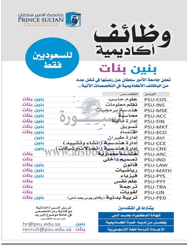 أعلنت جامعة الأمير سلطان عن حاجتها الى أعضاء هيئة التدريس، وعلى الراغبين فى التقدم ارسال السيرة الذاتية عبر الايميل المنشور فى الاعلان التالى: