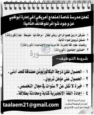 تعلن مدارس أبو ظبي عن وظائف جديدة للمعلمين والمعلمات وذلك وفقا لنص الإعلان التالي:-