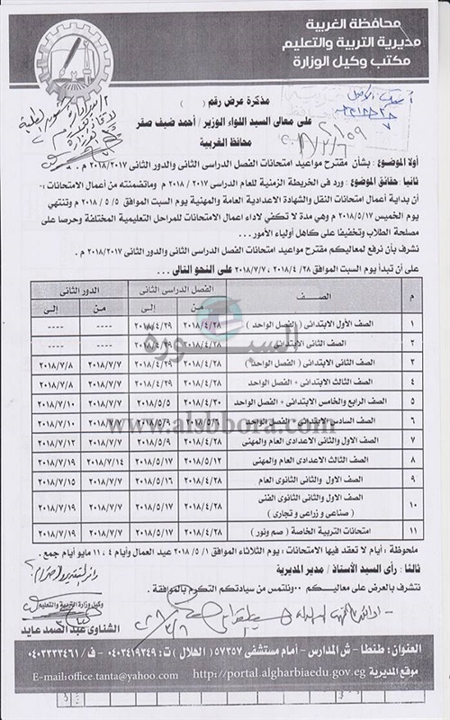 ينشر موقع السبورة مقترح لجدول مواعيد امتحانات الترم الثانى للعام الدراسى 2018/2017 لجميع المراحل التعليمية والتعليم الثانوى العام والفنى بجميع فروعه "تجارى صناعى زراعى" عن مديرية التربية والتعليم بمحافظة الغربية.