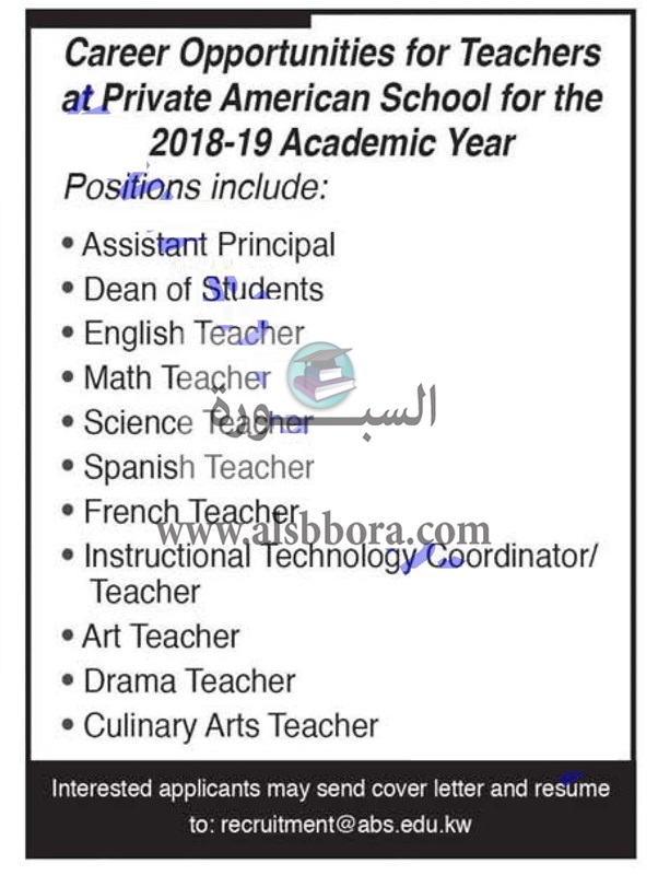 تعلن مدرسة خاصة في دولة الكويت عن وظائف جديدة للمعلمين والمعلمات في جميع المواد علما بأن أخر موعد للتقديم 26 مارس وذلك وفقا لنص الإعلان التالي :-