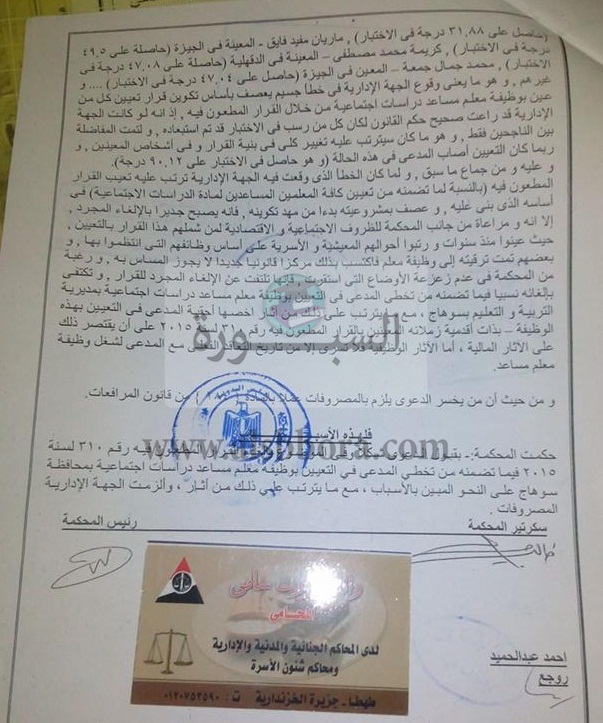 وجاء نص الحكم كالتالى " حكمت المحكمة بقيول الدعوى شكلا وفى الموضوع بالغاء القرار المطعون فية رقم 310 لسنة 2015 فيما تضمنة من تخطى المدعى فى التعيين بوظيفة معلم مساعد دراسات اجتماعية بمحافظة سوهاج على النحو المبين بالاسباب مع ما يترتب على ذلك من اثار والزمت الجهة الادارية المصروفات