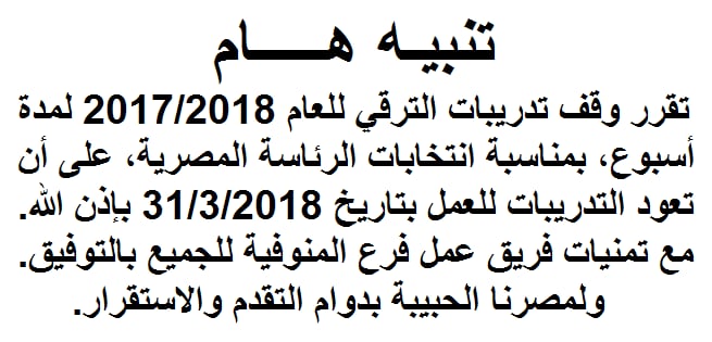 اعلن فرع الاكاديمية المهنية للمعلمين بالمنوفية عن ايقاف دريبات الترقى للمعلمين هذا الاسبوع وذلك خلال فترة انتخابات الرئاسة على ان يتم العودة مرة اخرى بعد انتهاء الانتخابات