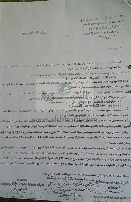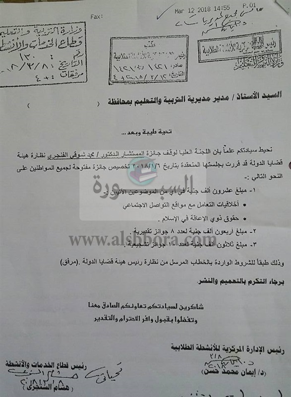 أرسلت هيئة قضايا الدولة خطابا الى مديريات التربية والتعليم على مستوى الجمهورية بشأن اقامة مسابقة كبرى لجميع المعلمين والمواطنين بجوائز قدرها 90 ألف جنيه وعلى الراغبين فى المشاركة ان يقدم البحث الى مكتب رئيس هيئة قضايا الدولة فى العنوان المذكور فى الخطاب التالى: