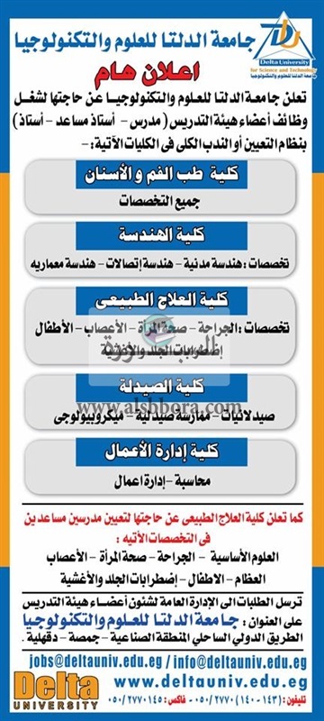 أعلنت جامعة الدلتا عن وظائف جديدة لأعضاء هيئة التدريس"من معيد إلي أستاذ ومدرسين مساعدين" في 20 تخصص علما بأن أخر موعد للتقديم الأسبوع المقبل وذلك وفقا لنص الإعلان التالي: