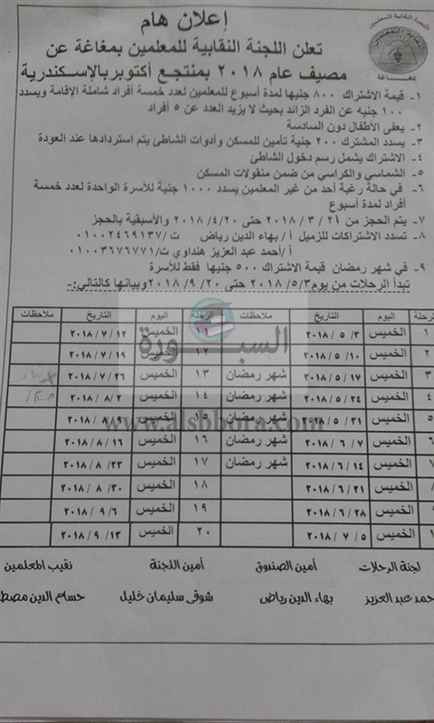 أعلنت نقابة المهن التعليمية فرع مغاغة عن مواعيد بدء رحلات المصايف الى منتجع أكتوبر بمحافظة الاسكندرية وقيمة الاشتراك وقدره 800 جنيه لمدة أسبوع