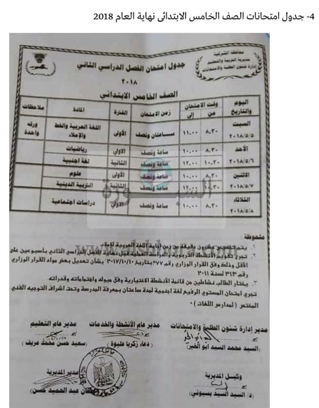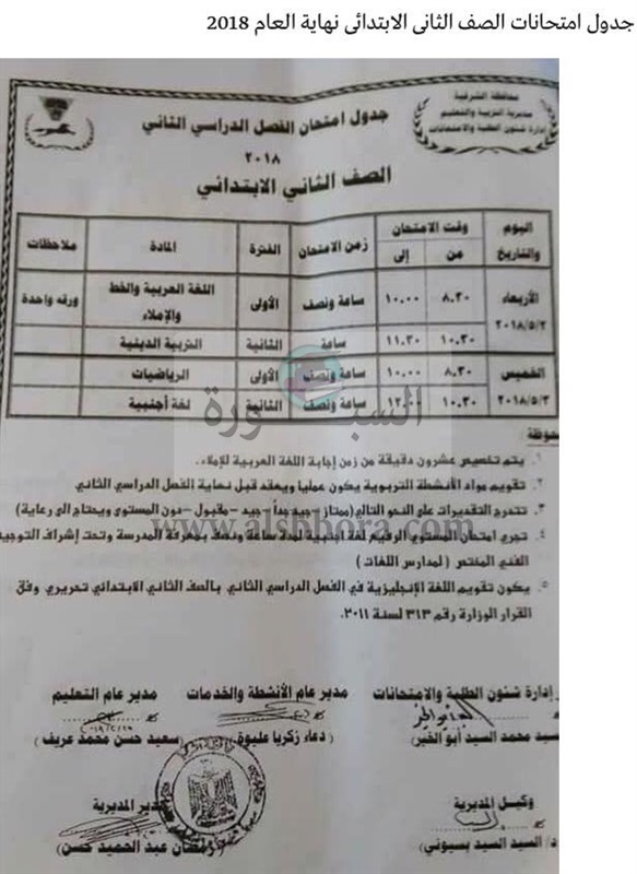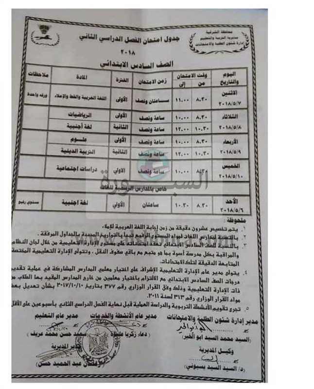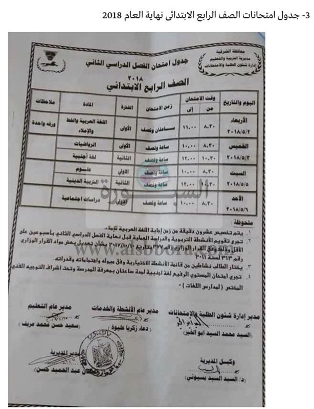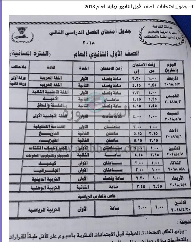 أعلنت مديرية التربية والتعليم بمحافظة الشرقية عن جدول امتحانات آخر العام للعام الدراسى 2018/2017، والتى جاءت كالتالى: