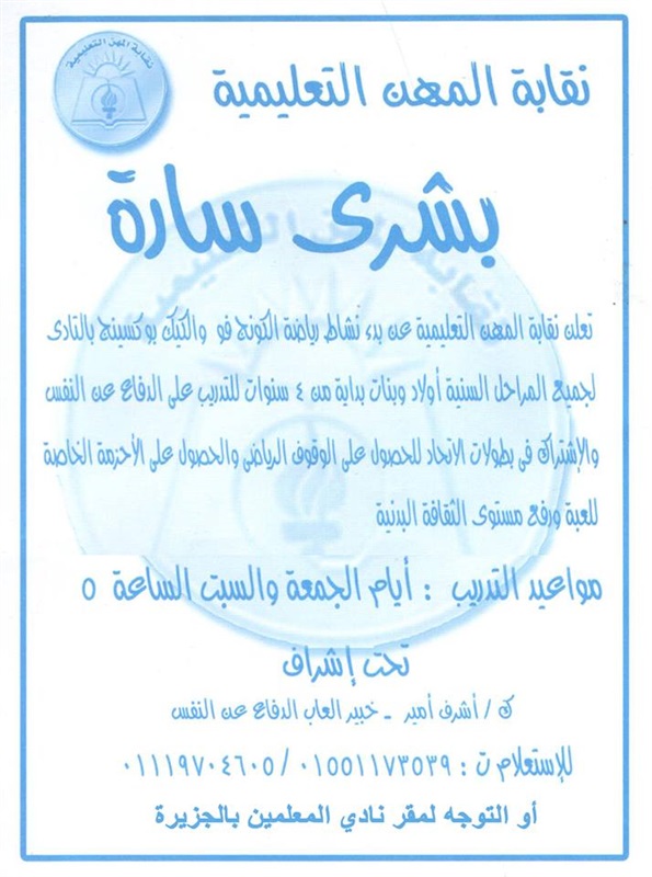 أعلنت النقابة العامة للمهن التعليمية، عن بدء نشاط رياضة الكونج فو والكيك بوكسينج بنادي المعلمين بالجزيرة لجميع المراحل العمرية أولاد وبنات من أبناء المعلمين بداية من 4 سنوات للتدريب على الدفاع عن النفس والإشتراك في بطولات الاتحاد للحصول على الوقوف الرياضي والحصول على الأحزمة الخاصة للعبة ورفع مستوى الثقافة البدنية، وكذلك بدء نشاط لعبة كرة القدم لتنمية مهارات الأطفال الكروية وتأهيلهم إلى اللعب في الأندية الكبرى بمصر.