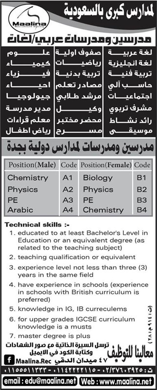 اعلنت كبرى مدارس المملكة العربية السعودية عن حاجتها الى عدد من الوظائف للمعلمين والمعلمات ووفقا للاعلان التالى: