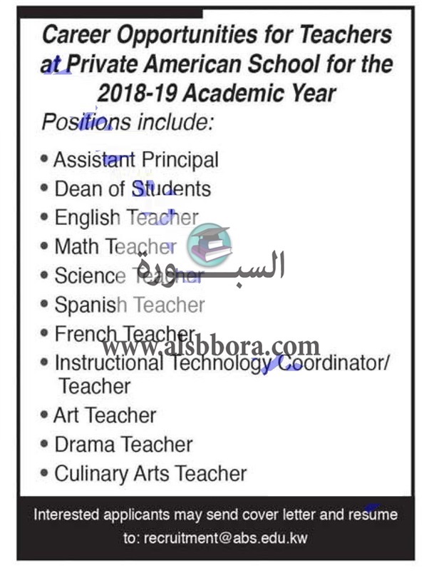 أعلنت عدد من كبري المدارس الكويتية عن وظائف جديدة للمعلمين والمعلمات في جميع المواد وذلك وفقا لنص الإعلان التالي :-