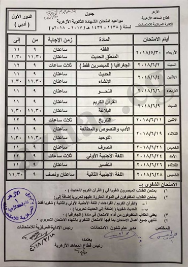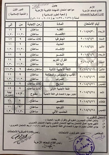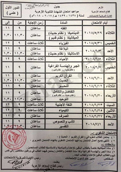 أعلنت الإدارة المركزية للامتحانات بقطاع المعاهد الأزهرية، مواعيد امتحانات الشهادة الثانوية الأزهرية؛ بأقسامها: العلمي، والأدبي، وشعبة العلوم الإسلامية، للعام الدراسي 2017/2018م، والتي ستبدأ بالقسم العلمي يوم الثلاثاء 29/5/2018، بمادتي: الفقه، والديناميكا، وتنتهي يوم الأحد 1/7/2018، بمادتي: الأدب والنصوص،والتفسير .