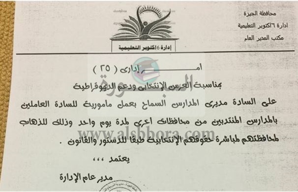 اصدرت ادارة 6 اكتوبر التعليمية قرارا اداريا للمدارس بمنح المعلمين يوم مامورية ووفقا للقرار التالى: