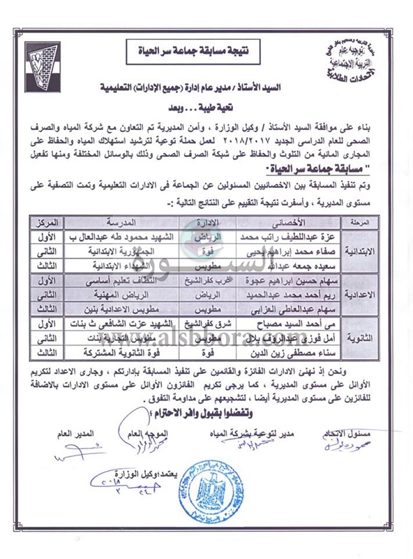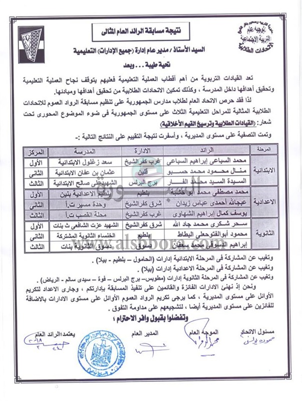 اعتماد نتيجة مسابقتى الرائد المثالى وجماعة سر الحياة فى تعليم كفرالشيخ