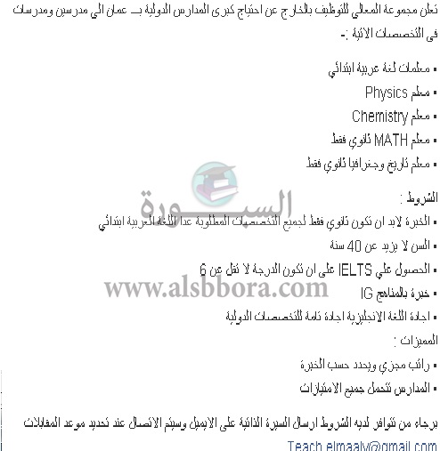 تعلن مدرسة خاصة في سلطنة عمان تعلن عن وظائف جديدة للمعلمين والمعلمات وذلك وفقا لنص الإعلان التالي:-