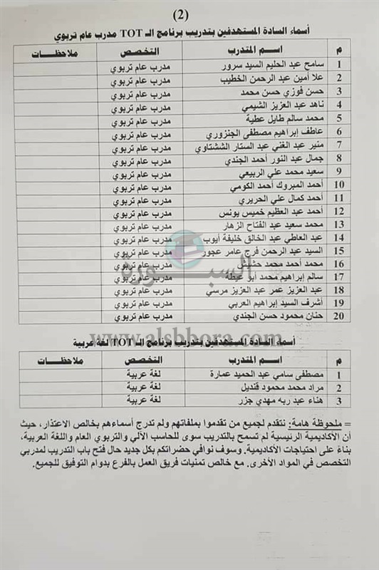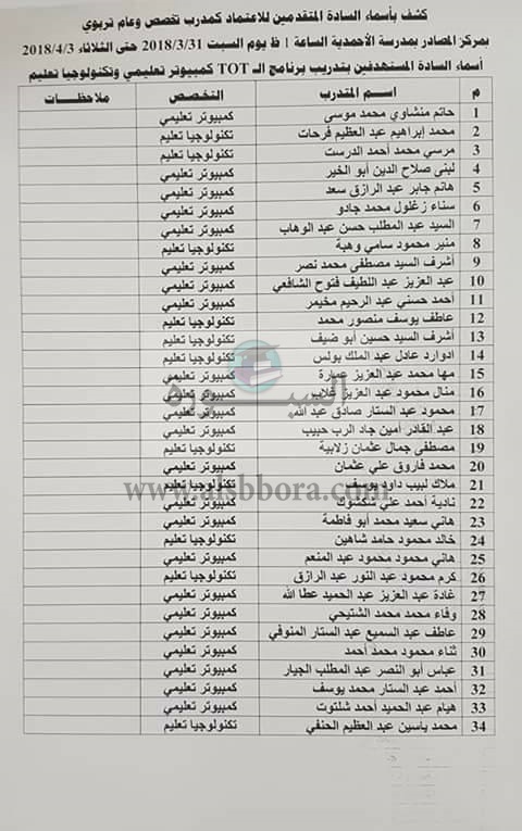 أعلنت الاكاديمية المهنية للمعلمين فرع المنوفية عن اسماء المعلمين الذين سوف يتم تدريبهم واعتمادهم مدربين تخصص وعام تربوي، على أن تبدأ الدورة في الواحدة ظهراً من يوم السبت 2018/3/31، جتى الثلاثاء 2018/4/3.