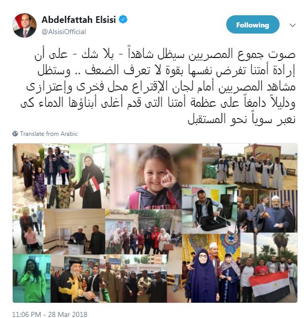 نشر الرئيس عبدالفتاح السيسى والمرشح الحالى للرئاسة تغريدة على موقع التواصل الاجتماعى "تويتر" عقب غلق باب التصويت بالانتخابات الرئاسية والتى جاءت كالتالى: