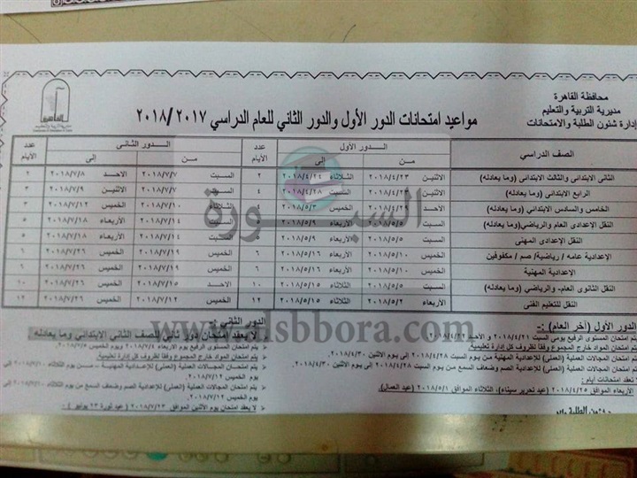 اعلن محمد عطية وكيل أول الوزارة مدير مديرية التعليم بالقاهرة أن امتحانات الدور الاول للفصل الدراسي الثاني بالقاهرة ستبدأ الاثنين الموافق ٢٣/٤/٢٠١٨ وتنتهي الاربعاء 16/5/2018 واشار عطية الي أن الاربعاء الموافق ٢٥/٤/٢٠١٨ إجازة عيد تحرير سيناءوالثلاثاء الموافق 1/5/2018 إجازة عيد العمال ولا تعقد فيهاامتحانات