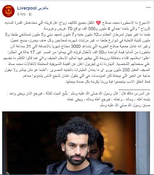 ابرزت صفحة "ليفربول بالعربي"، على موقع التواصل الاجتماعي "فيس بوك" عن الأعمال الإنسانية لنجم الفريق محمد صلاح، وتكفلة بتكاليف زواج 70 عريسًا وعروسة.