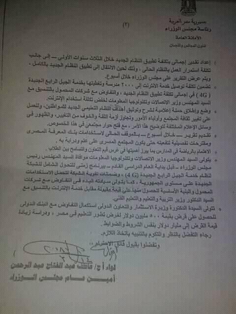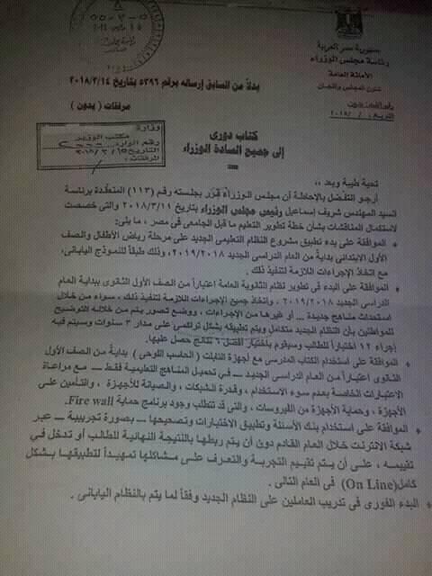 كما قرر مجلس الوزراء الموافقة علي استخدام التابلت مع الكتب المدرسية في تحميل المناهج مع مراعاة طاقة الشبكات وحماية الأجهزة من الفيروسات الإلكترونية وكذلك إجراءات التأمين عليها كما وافق علي استخدام بنك الأسئلة وتطبيقاتها بصورة تجريبية عبر الإنترنت مع ربطها علي أن يتم تطبيقها بشكل كامل بداية من العام الذي يليه.