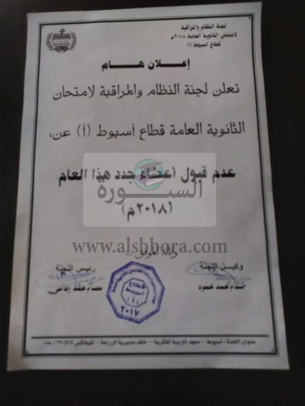 تعلن لجنة النظام والمراقبة كنترول اسيوط ا عدم قبول اعضاء جدد هذا العام 2018، لامتحانات الثانوية العامة للعام الدراسى 2018/2017.